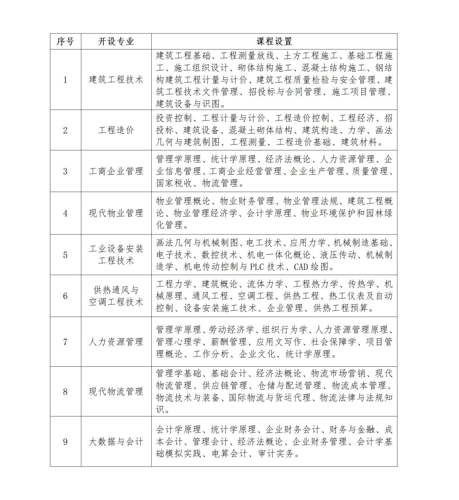 我校聚焦区域支柱产业,共开设9个专业,满足成人学习者职业提升需求。课程体系兼顾理论深度与实践实用性,专业核心课程涵盖岗位必备知识、实操技能训练模块,助力成人学员提升职业竞争力。开设专业及课程设置详见下表: