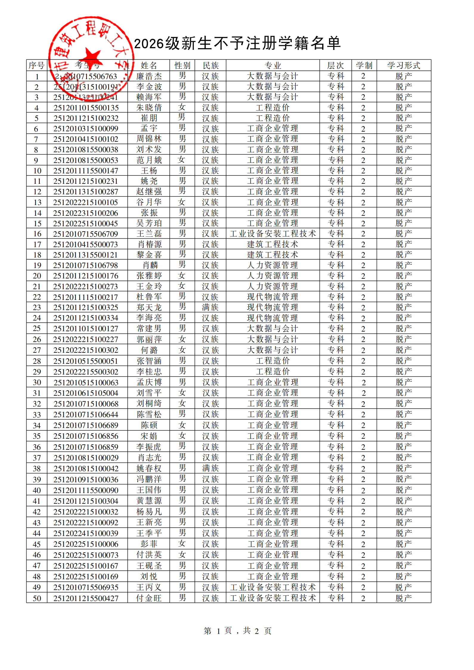 关于2026级录取新生不予注册学籍的公示