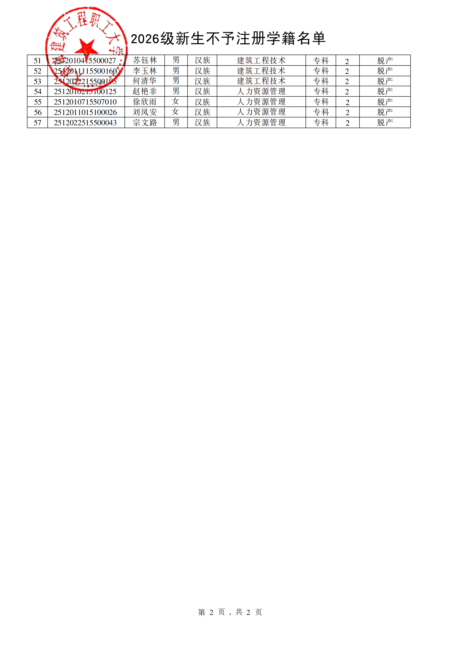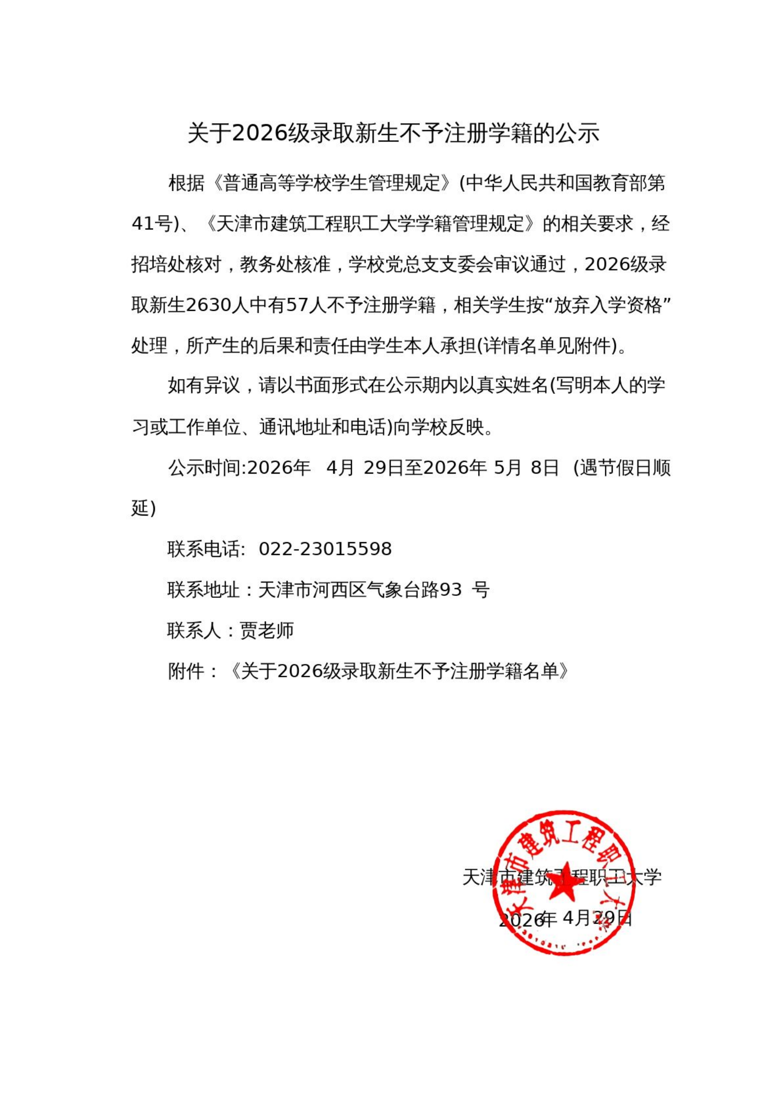 关于2026级录取新生不予注册学籍的公示